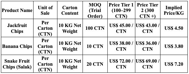 All prices are quoted in US Dollars (USD) and are based on a 10 KG Net Weight Carton (CTN).