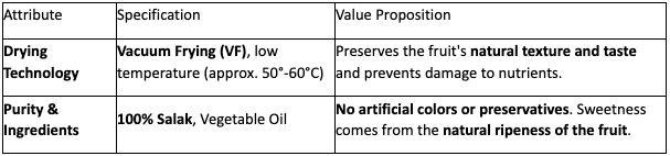 Processed using Vacuum Frying (VF) technology, we preserve the fruit’s unique aroma and nutritional integrity.