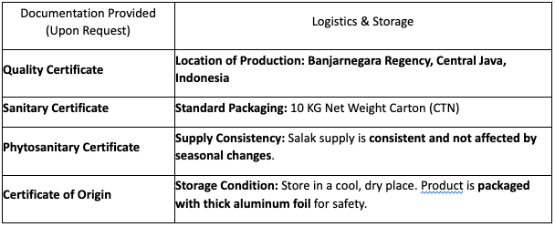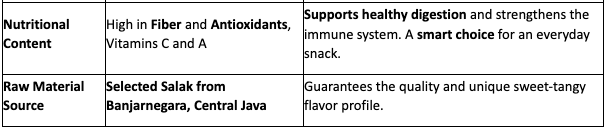 Our Snake Fruit Chips offer a bold and unique twist on snacking. Made from selected snake fruits from Banjarnegara Regency, Central Java, they deliver a satisfyingly crunchy bite with a distinctive sweet and tangy flavor.