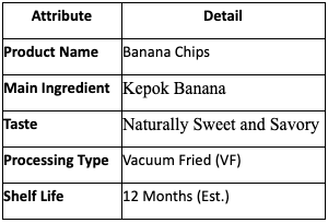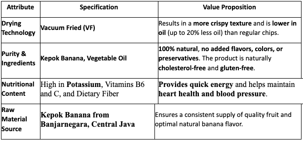 Our product is thinly sliced and processed using Vacuum Frying (VF) technology, ensuring a crunchy texture without losing the banana’s natural flavor.