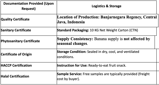 Experience the natural sweet and savory taste of our Banana Chips. We use only the finest raw materials, specifically selected Kepok Bananas sourced from the abundant supply in Banjarnegara Regency, Central Java.